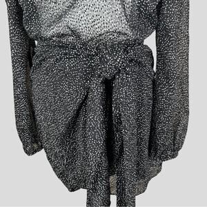 White and black speckled pattern on a black sheer fabric mini draped faux wrap dress, skirt is fully lined with a wrap around skirt tied up on left hip, sheer style top and long sheer sleeves with elastic cuffs.