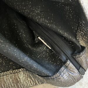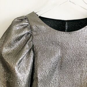 Zara textured, metallic, pewter, silver, puff, short sleeve, crop blouse with side zip. Gently used.