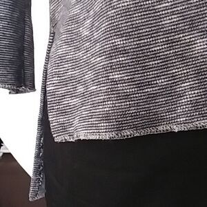 Zara Trafaluc early 60s style boxy striped heather charcoal top. Sweatshirt type material. Stretchy and 100% cotton. 3/4 length sleeves with a high low hem and slits at the sides. It's kind of a cropped tunic style if that's possible? Reminds me of the early 60s style Audrey Hepburn wore in Breakfast at Tiffany's. The part where she's wearing her hair in 2 pony tails and is spending the day with Fred talking about her fiance. It is a different color etc. but the boxy shape and neck makes me think of that. It would look so Audrey with a pair of ankle length cigarette pants like she wore. Excellent pre-owned condition with no flaws.