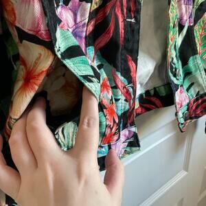 Zara Trafaluc tropical printed cropped denim jacket. Button front. Inner and outer pockets.