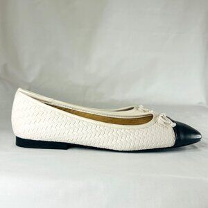 Chic and versatile Zara Trafaluc ballet flats in a classic white woven texture with contrasting black cap toe. Features a delicate bow detail for a polished look. Never worn (NWOT). Perfect for pairing with casual or dressy outfits alike.