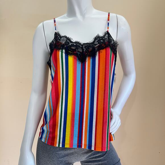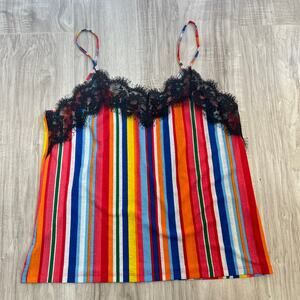 Zara Trafaluc Womens Cami Top Size L Colourful Rainbow Stripe Black Lace Trim