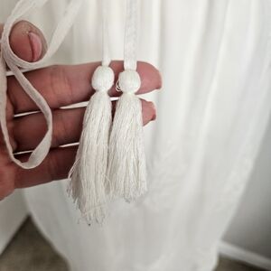 festival season or summer in general. It is made of mesh material with an embroidered design throughout. It has a short lining, and the rest of the skirt is semi-sheer. It has an elasticized waistband with tassle drawstrings.