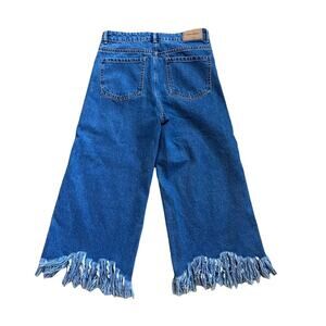 Zara Trafuluc Wide Leg Cropped Culottes Jeans. Features an exaggerated fringe at the hem, denim construct, high waist, straight through the hip and wide leg.