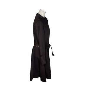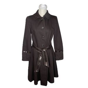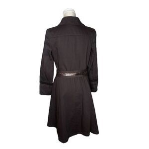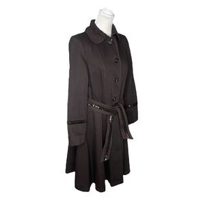 Zara Trench Coat with Peter Pan Collar & Sequin Embellishment Detail. Features tailored fit with long lines, button down front. Peter Pan collar and sequin details on cuffs and tie waist belt (self tie). Absolutely stunning! Understated with a little bling. Color is a rich chocolate brown. 100% cotton exterior with rayon lining. Super sturdy and well made. Rare find. Please see measurements, this runs small for a large. Measurements in pictures.