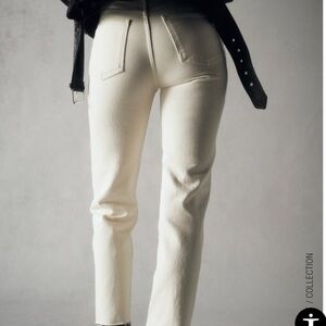 High-waisted five pocket jeans in rigid fabric. Front metal button closure