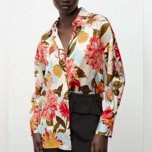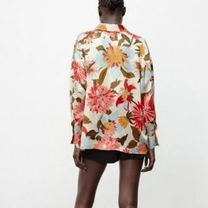Zara Tropical Floral Satin Button Down Blouse – Medium