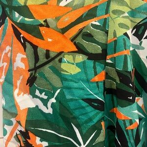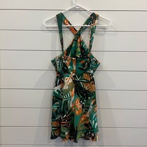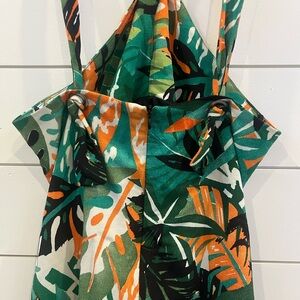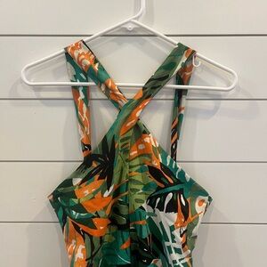 Vibrant tropical print jumpsuit. Features criss-cross straps. Perfect for summer.