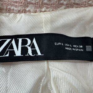 Women's Zara pastel pink and cream textured blazer, size large. Very good, clean condition. No stains, holes or rips. Smoke free/pet free. Please see all photos for details with measurements, and ask any questions. Orders are shipped out daily, Monday – Friday.