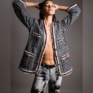 Zara Tweed Boucle Black Red White Blazer Jacket Coat Boho Fringe Hippie Blogger