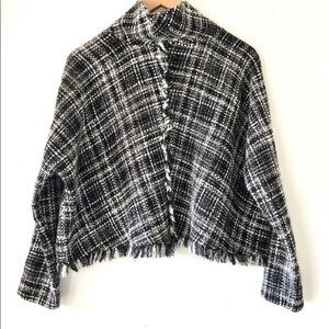 Zara Women's Shirt Oversized Boucle Black White Tweed Plaid Pull Over Mock Turtleneck Dolman Drop Shoulder Long Sleeves Fringe Waist Length Hem. Turtleneck can be folded down or kept up.