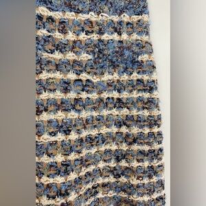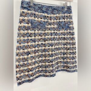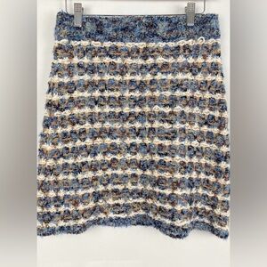 This brand new Zara mini skirt features a stylish blend of blue, cream, gold, and brown chunky knit. With faux front pockets and a flattering mini length, it’s perfect for adding a cozy yet chic touch to any outfit. New with tags.