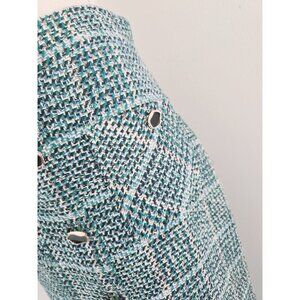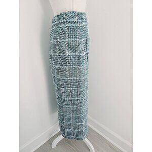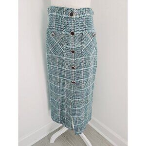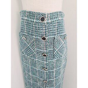 Zara Tweed Cotton Blend Faux Button Front Green Plaid Straight Pencil Skirt M