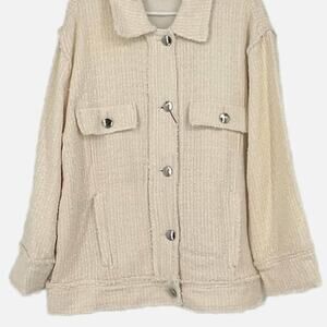 Zara Tweed Frayed Hem Overshirt in Cream Size XXL