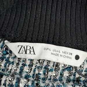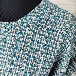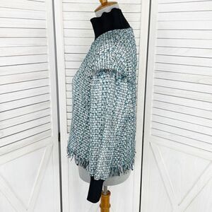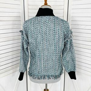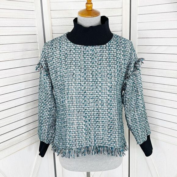 Zara Tweed Fringe Hem Mock Neck Shirt Teal White Large Crop