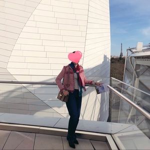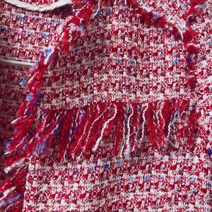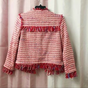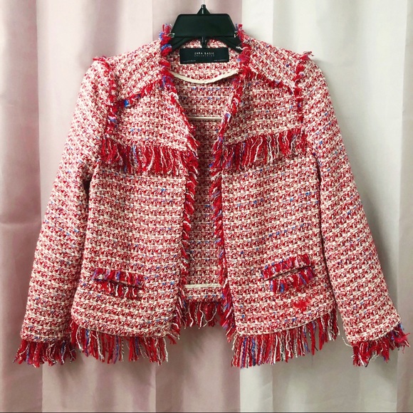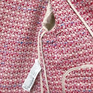 Like new, Chanel style Zara tweed jacket from last year’s collection. Real item looks more reddish/pinkish in general compare to the photos. Wore it a couple of times and kept in excellent condition, never washed or dry cleaned.