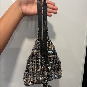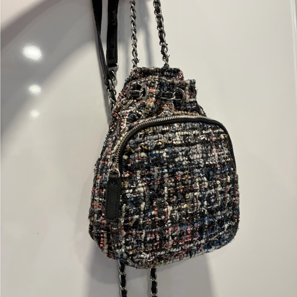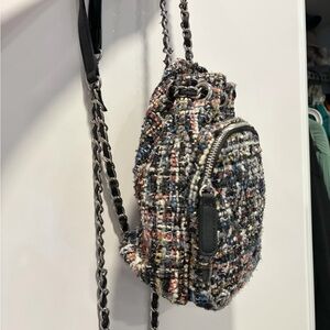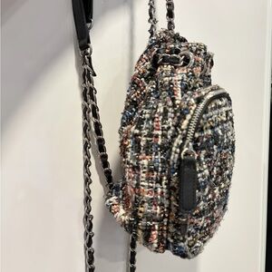 Stylish tweed mini drawstring backpack in black multi. Features a front zip pocket and chain-link shoulder straps for a chic look. Lightweight and versatile for everyday use. Black multi color adds textured interest to any outfit. Leather is peeling on the straps, will accept offers!