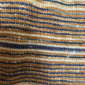 Multicolored tweed skirt, with buttons down the middle. Knotted belt. Pleated. A few runs but they are hard to notice.