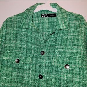 Zara Tweed Textured Woven Plaid Fray Overshirt Shacket Shirt Jacket Green Large