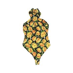 This beautiful Zara halter top bodysuit is a must-have for any fashion-forward woman. The striking floral pattern in shades of yellow and the twist neck design make it a unique and stylish choice. The sleeveless top is perfect for warm weather and can be dressed up or down for any occasion.
