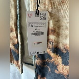 Unique vest with photographic design. Features blue, tan, and brown tones. Perfect for layering. Does run large (by design) so could fit a med/large also. I’m size small and it’s big.