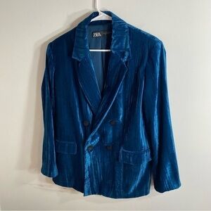 Zara Velvet Blazer Jacket Medium Double Breasted Wrinkled Look Women’s Blue