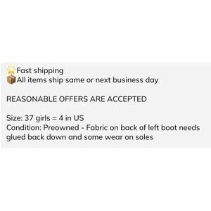 Condition: Preowned - Fabric on back of left boot needs glued back down and some wear on soles