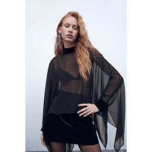 Semi-sheer blouse with a high velvet collar, matching velvet cuffs, open cape sleeves, and a back button closure. Three buttons secure the neckline. Fits true to size. Material: 100% polyester