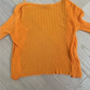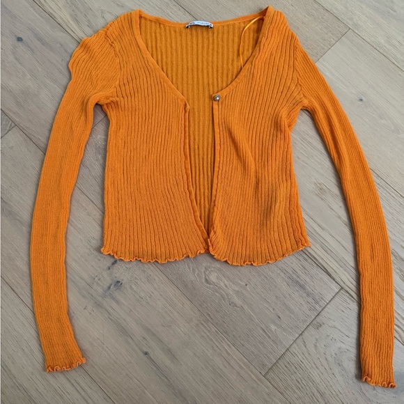Vibrant orange knit cardigan with ribbed texture. Features a stylish button detail.