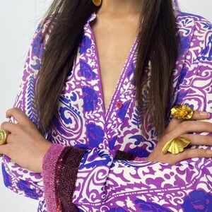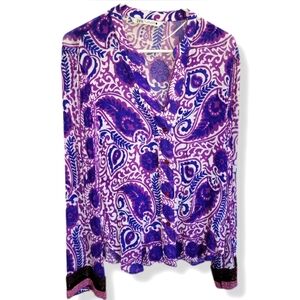 This elegant blouse from Zara features a vibrant paisley pattern in shades of purple. Designed with a deep v neck, button down front and beaded long sleeve cuffs, it offers a sophisticated yet comfortable fit. The buttoned style adds a touch of classic charm, making it perfect for both casual and formal occasions.