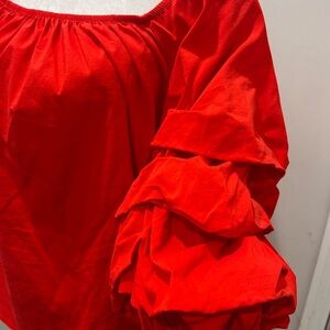 Bold red blouse with ruffled sleeves. Off-shoulder design. Perfect for stylish outings.