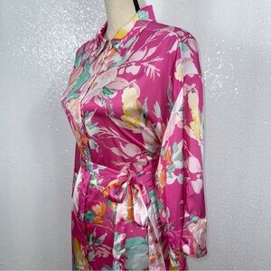 Zara Satin Bright floral design with a tie waist. Soft and stylish for lounging. Button down kimono dress with belt attached. In excellent condition