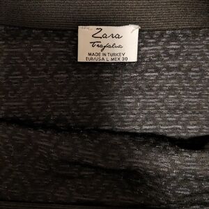 Size L. Stretchy material. No fabric tag, but would assume a polyester blend. Elasticized waistband. Mesh interior.