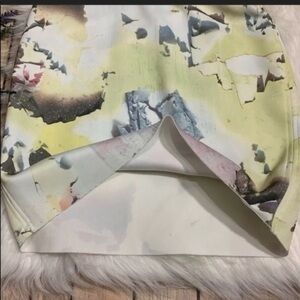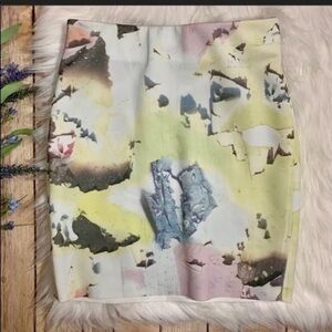 Zara W&B Collection Pencil Skirt with a geometric ‘shattered’ design featuring light multi color scheme. Features a fold over waistband and a stretchy material.