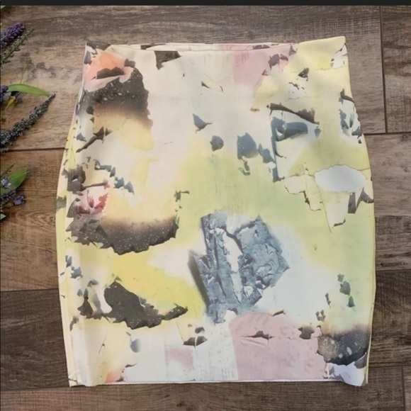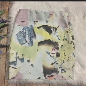 Zara W&B Collection Pencil Skirt with a geometric ‘shattered’ design featuring light multi color scheme. Features a fold over waistband and a stretchy material.