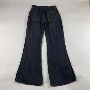 Well worn condition,100% linen lightweight pant has signs of wash/wear - faded - but no legitimate defects that take away from the overall aesthetic or functionality. 4 pockets, zip front, back elastic waist inset, belt loops, flared wide legs. Size Small, please reference measurements for sizing & fit inquiries.