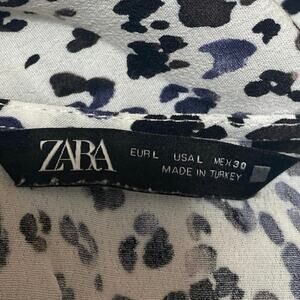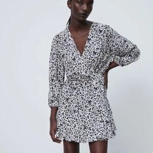 Zara White Black Leopard Long Sleeve V Neck Pleated Faux Wrap Aline Mini Dress L