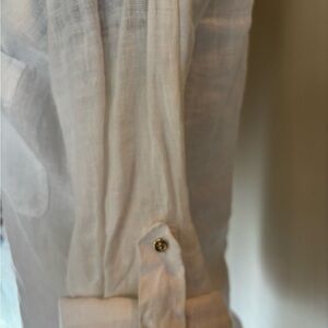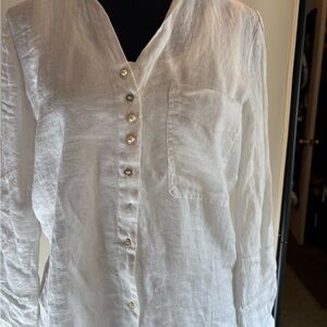 Elegant white blouse with button-up front. Features a chest pocket. Lightweight and stylish.