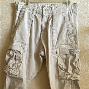 These Zara white cargo pants feature a modern tapered fit, crafted from a comfortable cotton-blend fabric. Their sleek design makes them a versatile choice for casual occasions, offering both style and functionality.