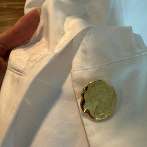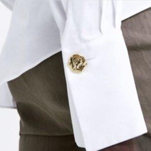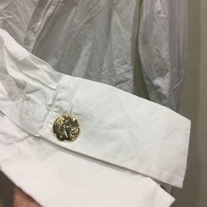 A twist on the classic, crisp, white cotton blouse. Collared top with faux wrap across the front of blouse. Sleeves are wide with gold button details.