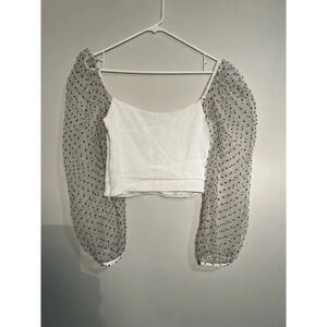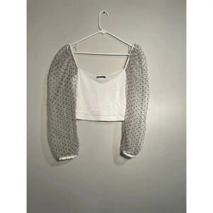 Zara White Cropped Mesh Puff Sleeve Swiss Dot Top