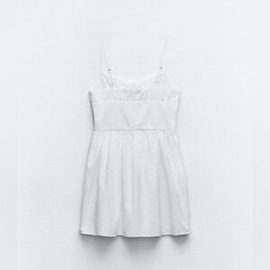 Short dress with V-neckline, opening, and tie. Adjustable thin straps. Side hidden in-seam pockets. Tonal embroidered detail. Interior lining. Side hidden in-seam zip closure.