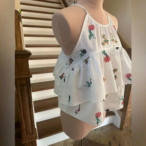 This Zara embroidered halter tank is a breezy, feminine piece perfect for vacations, warm-weather getaways, or everyday summer wear. Lightweight cotton with colorful floral embroidery and a tiered ruffle silhouette—effortless, airy, and chic.