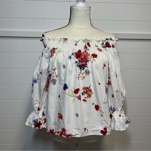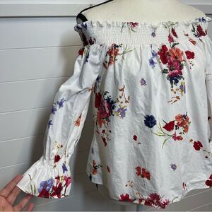 Flirty and fun Zara off-the-shoulder top featuring a colorful floral print with back button up closure. Lightweight and breezy—perfect for warm days and summer nights. Pair it with denim, skirts, or trousers for a trendy, effortless look.