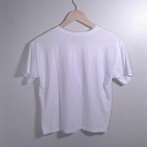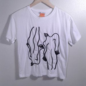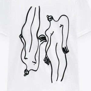 Stylish white tee with artistic black graphic. Short sleeves. Perfect for casual wear.