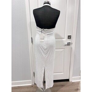 Elegant Zara white midi dress with halter neckline. Perfect for evening wear. This has little crystals over the entire dress that makes you sparkle like a diamond mirror! Not over the top, classy sparkle. Perfect for a bridal shower or date night.