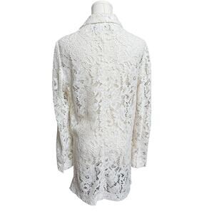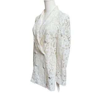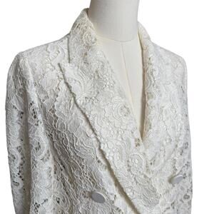 Elegant white lace jacket. Features intricate lace design. Perfect for layering.