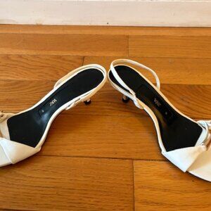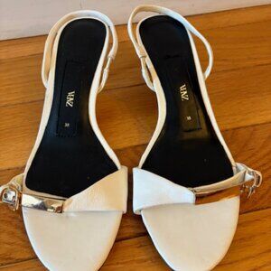 Super cute and comfortable Zara white strappy kitten heeled sandals with gold buckle in the front. Size 38, worn once and stored in a smoke free home. In very good to excellent condition.