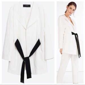 Zara White Long Jacquard Blazer Jacket Sash Tie