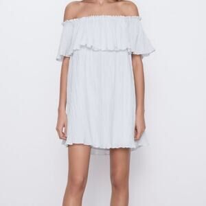 Zara White Off Shoulder Pleated Plisse Mini Dress XS